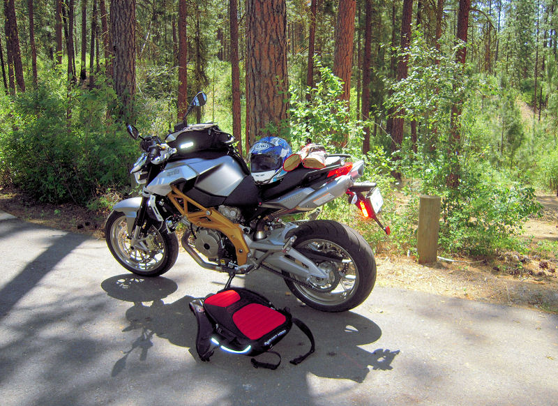 This was at a lunch stop along the Columbia River in Washington. I used a Cortech tankbag with a Passport 8500 (radar detector) inside, and a Garmin 276C (GPS) mounted on the front. The red/black thing on the ground is an Ogio No Drag backpack designed for motorcyclists (with my 13" MacBook Pro inside). I'd started out with an Aprilia tailbag, but it interfered with the backpack, so I left it and some stuff at home.