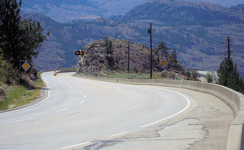 Here's the first of the switchbacks that descend 3000' to the lake from where I shot the previous photo. It's marked 20kph, but 25mph worked pretty well. It was cool and pleasant here, but pretty hot in Osoyoos (in the 90's).