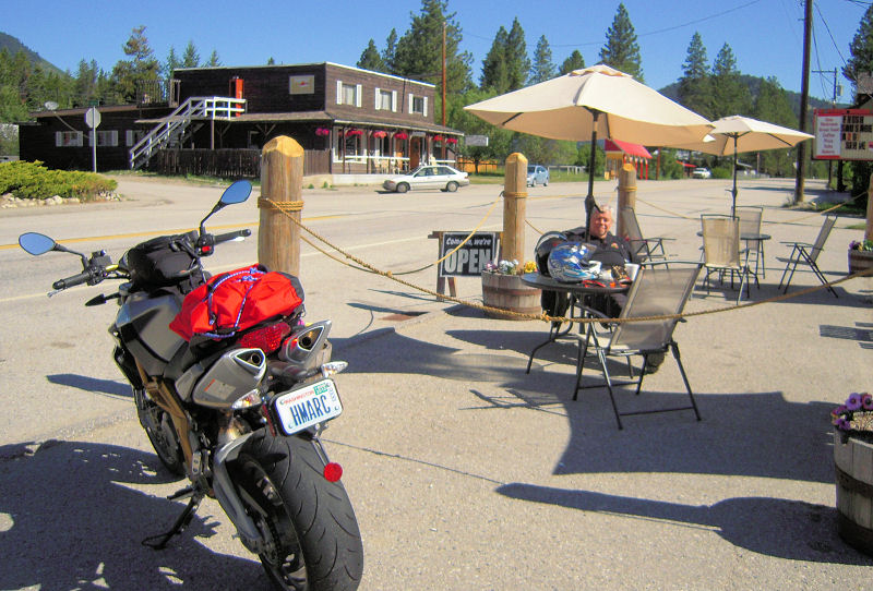 Destination Highways says Hwy 3A down the east side of Kootenay Lake is the best motorcycle road in southern B.C. They're right. Phil and I were among the first off the ferry, and we quickly dispatched the few cages in front of us. The upper 25 miles have recently been repaved, and we enjoyed tilting the horizon all the way to Creston while encountering only 2 cars the whole way (both easily and safely passed).