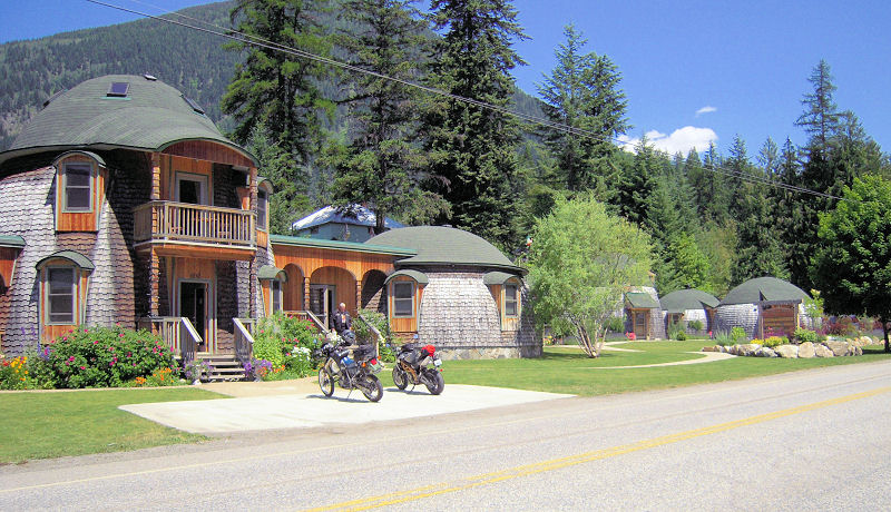 After turning south at Salmon Arm and spending the night in Vernon, we took Hwy 6 to the ferry across lower Arrow Lake and up to Nakusp where we had a nice lunch downtown. Then down to New Denver where we rode past this place, and I had to turn around to get a shot of it.