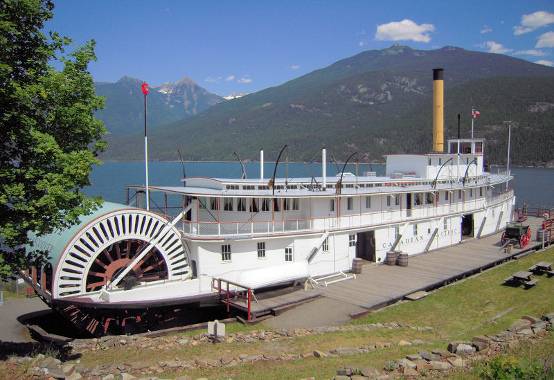 In Kaslo we stopped for a cool drink and parked near this old steam stern-wheeler. Built in Nelson in 1898 to provide transportation on Kootenay Lake, but apparently retired now, as it sits about 10' above the water.