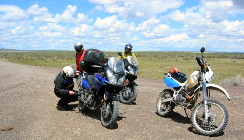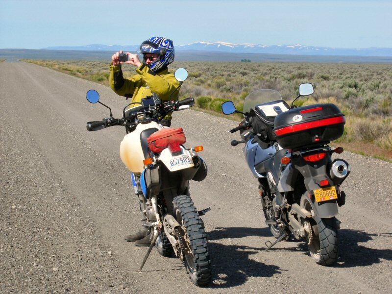 For bikes, we had an XR650L (me), and two Wee-Stroms (aka Suzuki DL-650), with Phil & Debb riding two-up. They started out from Seattle on two KLR650s (which would have been ideal for this ride), but one quit before they left the house, so they substituted the DL. The other KLR wouldn't restart after an ATM stop in Yakima, WA, so they pared down the luggage to fit in a tank bag and a tail box, and continued two-up.