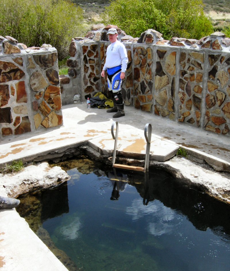 Mark at Hart Mt. Hot Springs. This is the "improved" one, which was recently more improved by the addition of some nice natural slate to the construction brick walls. It's still kinda institutional, but we jumped in and enjoyed it anyway.