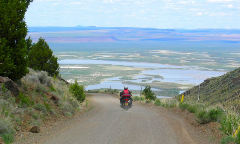 After a nice lunch and warming up in Burns, we headed out on 20/395 to Sage Hen Hill summit, where we turned south on "OO" road towards Harney lake. The photo above was taken just north of the lake where we turned back west to pick up OR-205 into Frenchglen. We lowered our tire pressure several times, and mostly all ran about 25psi on both ends.