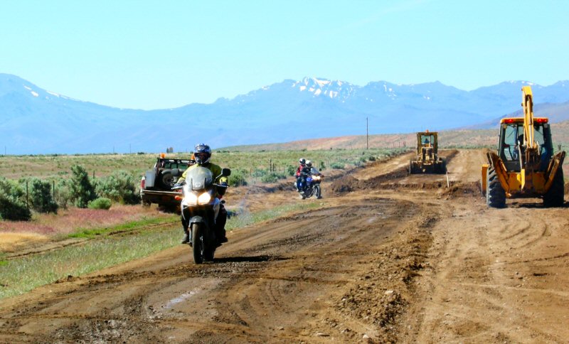 Just north of Fields, a gravel road runs up the east side of the Steens, with the Alvord Desert (and when we passed by, Alvord Lake, which is normally dry) on our right. There was a bit of road construction going on, which was odd, as there wasn't anything wrong with the gravel road. It did make it a bit squirrelly for the DL-650s...