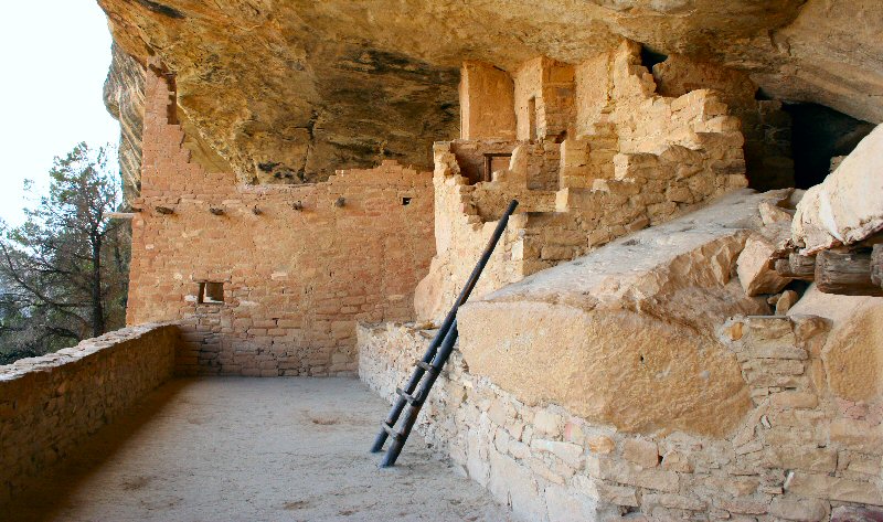 After riding some of Colorado's fine mountain roads and passes, I arrived at Mesa Verde and bought a tour of Balcony House, in Soda canyon. It's one of the more interesting ruins, but requires a couple tricky climbs up long (30+ foot) wooden log ladders, and a couple crawls through very short and narrow tunnels -- not the best plan for someone afraid of heights like me, but I've done it before so I knew I'd be okay. This is the first view you get, after climbing the ladder and squeezing through a tunnel.