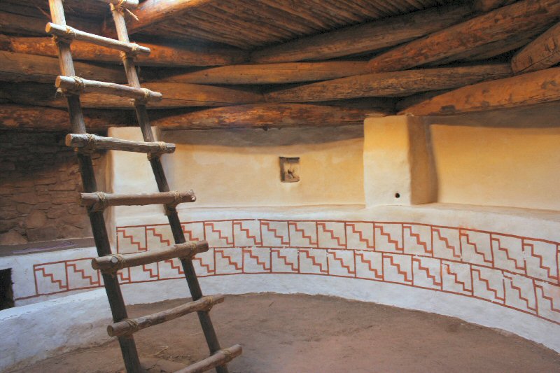 This is inside the kiva, in natural light. Whereas most kivas are unrestored, this one when first excavated still had some of the orignal "plaster" with the original artwork (though the colors were reversed, originally it was a white pattern on dark brown walls). So Mr. Kelly restored this as he thought it would have looked when used by the Ancient Puebloans.