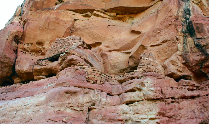 The Ancient Puebloans built these structures using sandstone, which they shaped into brick-like blocks and stuck together using a mortar made from mud and water. For some of the structures, it must have been very difficult simply getting the building materials to the site. It's thought that they may have used ropes to lower bundles from the cliff top above.